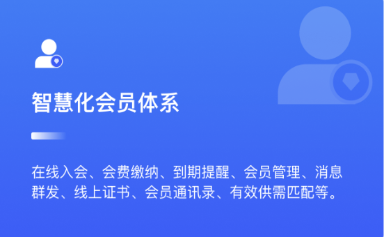 新一代数字化商协会运营管理系统,以“智慧化会员体系、智敏化内容运营、智能化活动构建”三大板块为基点,实施功能全场景覆盖,一站式解决商协会需求壁垒,有效快速建立自有数字化管理体系、提升组织管理效能、增强会员粘性、沟通连接市场,真正做到为构建有影响力的现代化智慧型组织赋能。